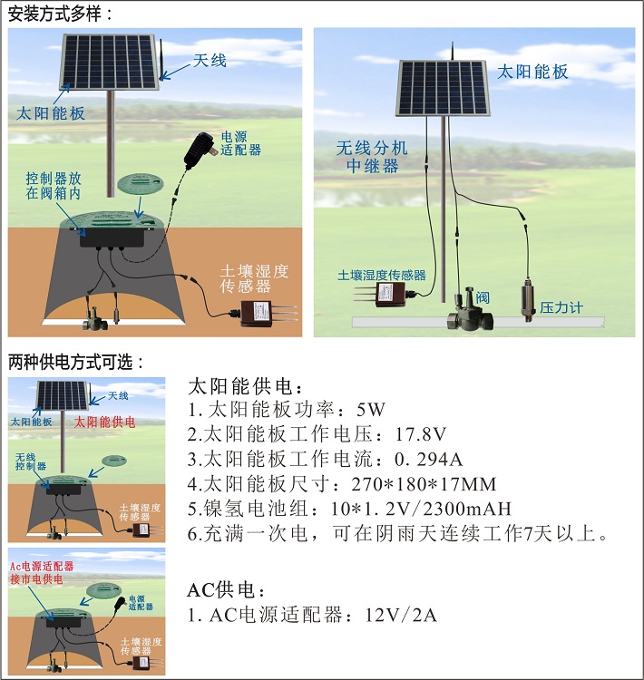 1MS1V-Cover-Blue-T | ![]() | 可控制|:1个脉冲电磁阀 1个压力检测 1个土壤湿度传感器 供电方式:太阳能板+镍氢可充电电池供电; 或12V/2A AC电源适配器供电。 |