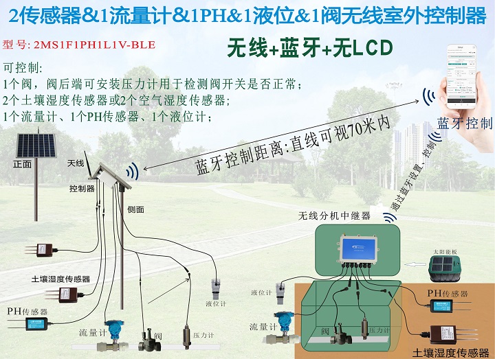 | 2MS1F1PH1L1V-BLE | ![]() | 可控制: 2个土壤湿度传感器 1个阀(带1个压力检测) 1个区域流量计 1个PH传感器 1个液位计 太阳能供电,使用10*2300mAh AA可充电电池(电池不含在产品内),可选AC供电。 可蓝牙控制,无LCD,密封性良好。 | |