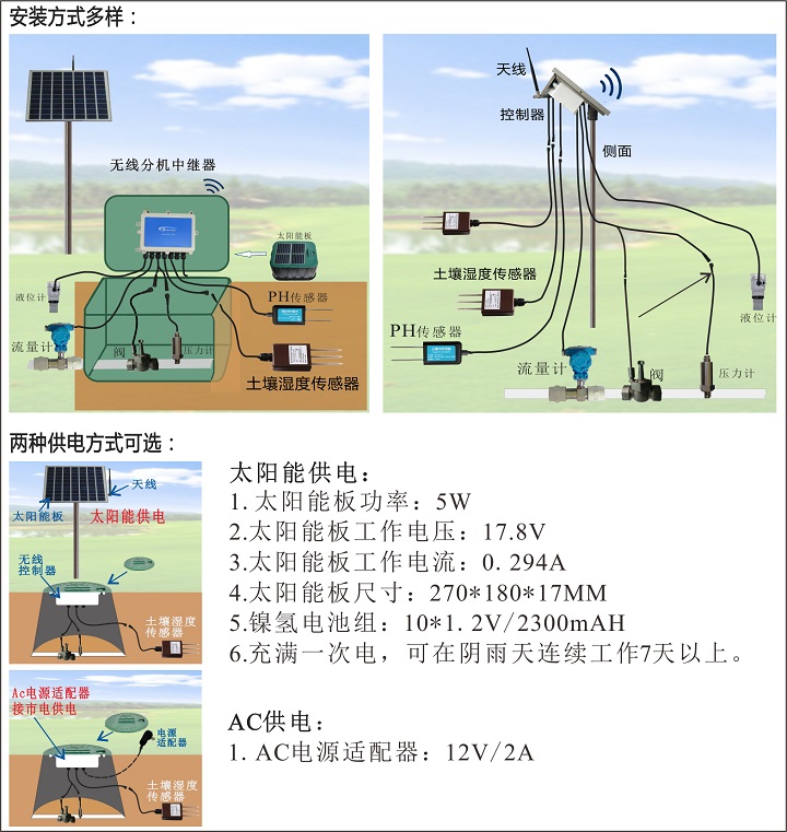 1.双向无线通讯, 太阳能供板+12V/2300mA可充电电池供电,也可以选用AC供电, 田间无须电源线和覆盖WiFi, 安装及维护成本低。